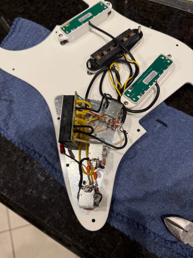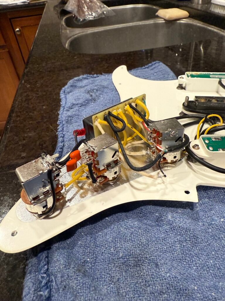 The full range hum bucker pickups didn’t sound the best..so I started with an OEM pickgaurd, installed Wilkinson M Series Humbuckers with Alinaco 5 magnets..500k push/pull pots for splitting to single coils, and for 22uf and 47uf caps on the tone dial. this whole setup really brought out the voice in this limited edition..