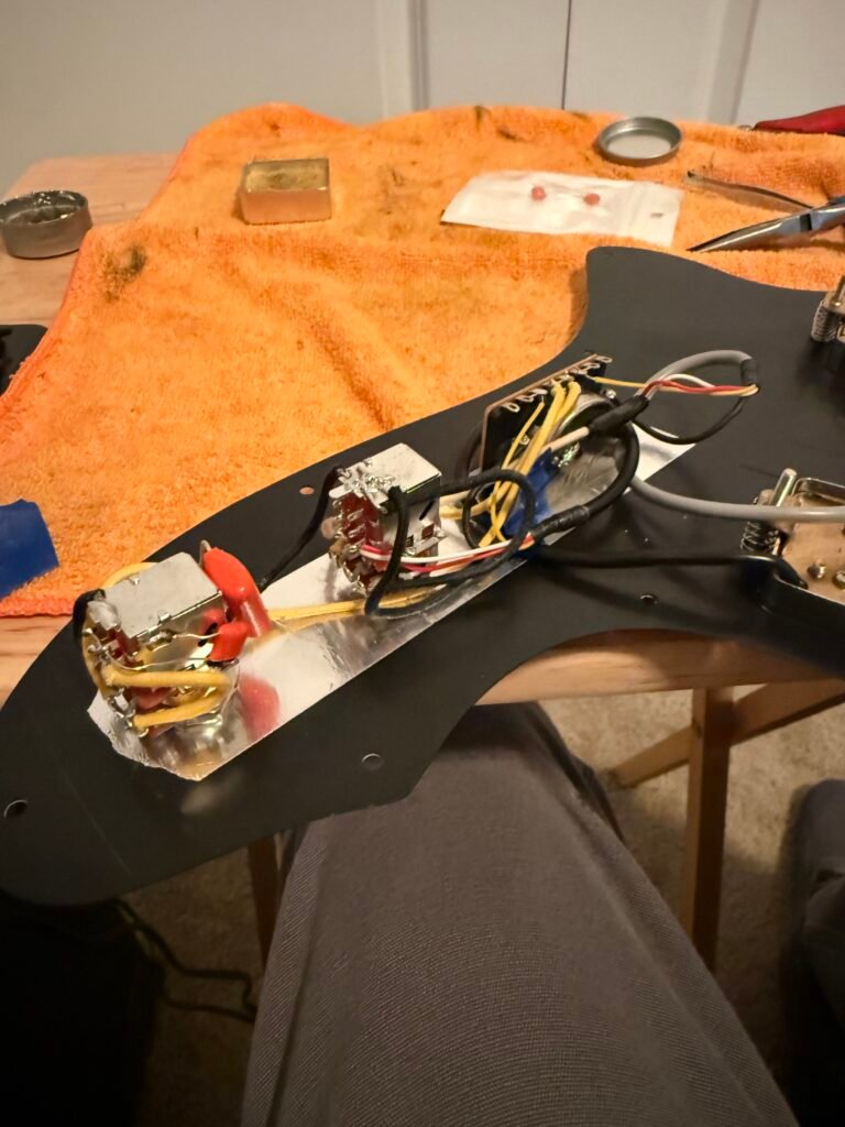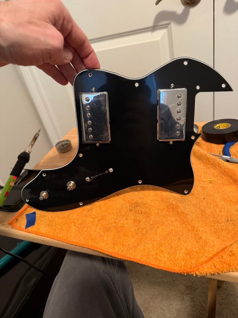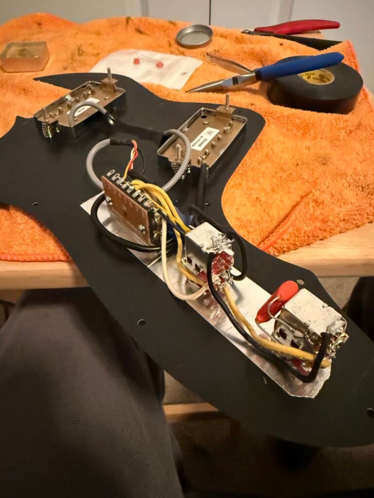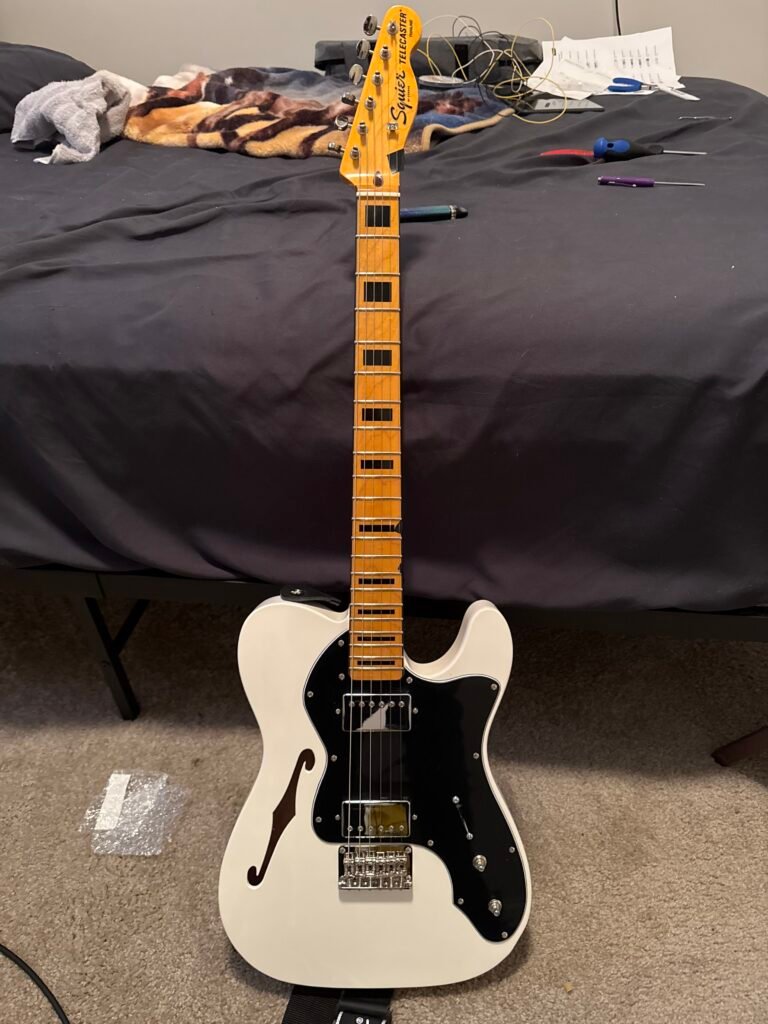 I didn’t appreciate the stock cheap single coils, so I swapped in Seymour Duncan single space hum buckers for a more of what I wanted, and also wired in a Free-way5/10 way switch which does all crazy things with pickups. 500k push/pull pots to split for awesome single coil noise and same the the tone pots, 47k orange drop caps on both tone pots. Lots of fun, sounds like a Hot Rod with strings…