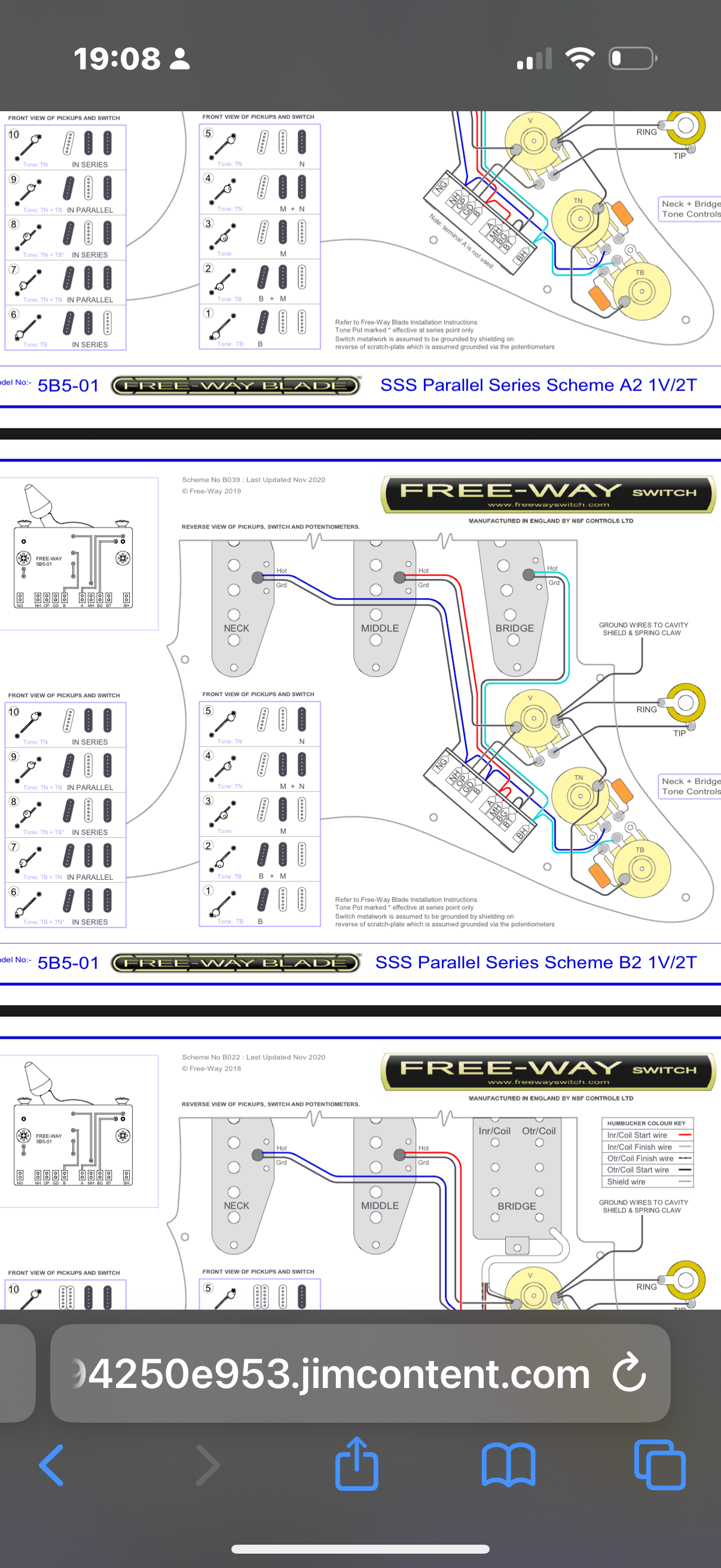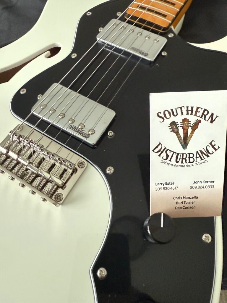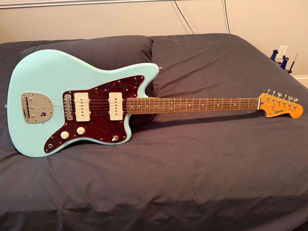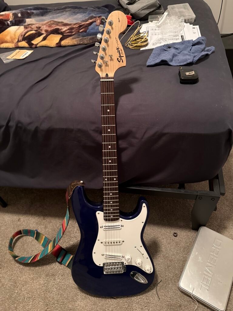 I didn’t appreciate the stock cheap single coils, so I swapped in Seymour Duncan single space hum buckers for a more of what I wanted, and also wired in a Free-way5/10 way switch which does all crazy things with pickups. 500k push/pull pots to split for awesome single coil noise and same the the tone pots, 47k orange drop caps on both tone pots. Lots of fun, sounds like a Hot Rod with strings…